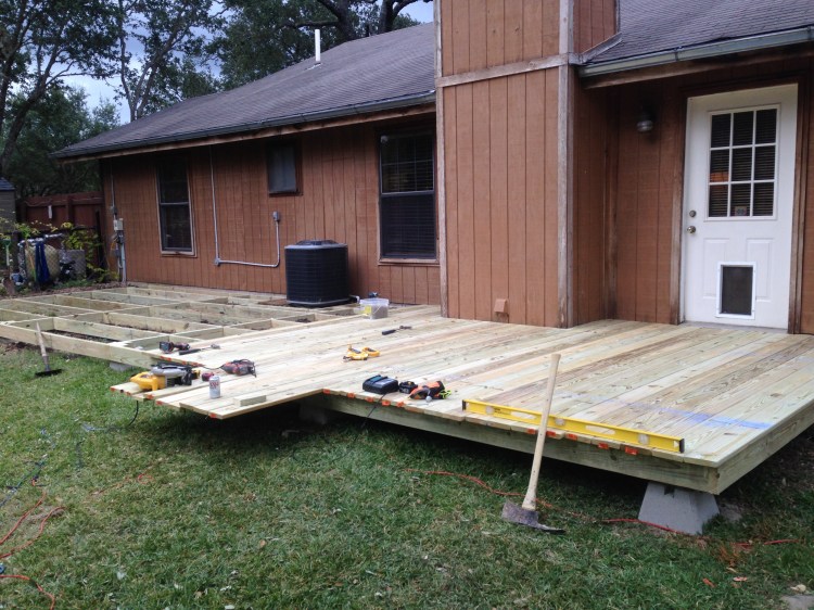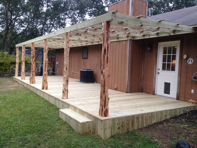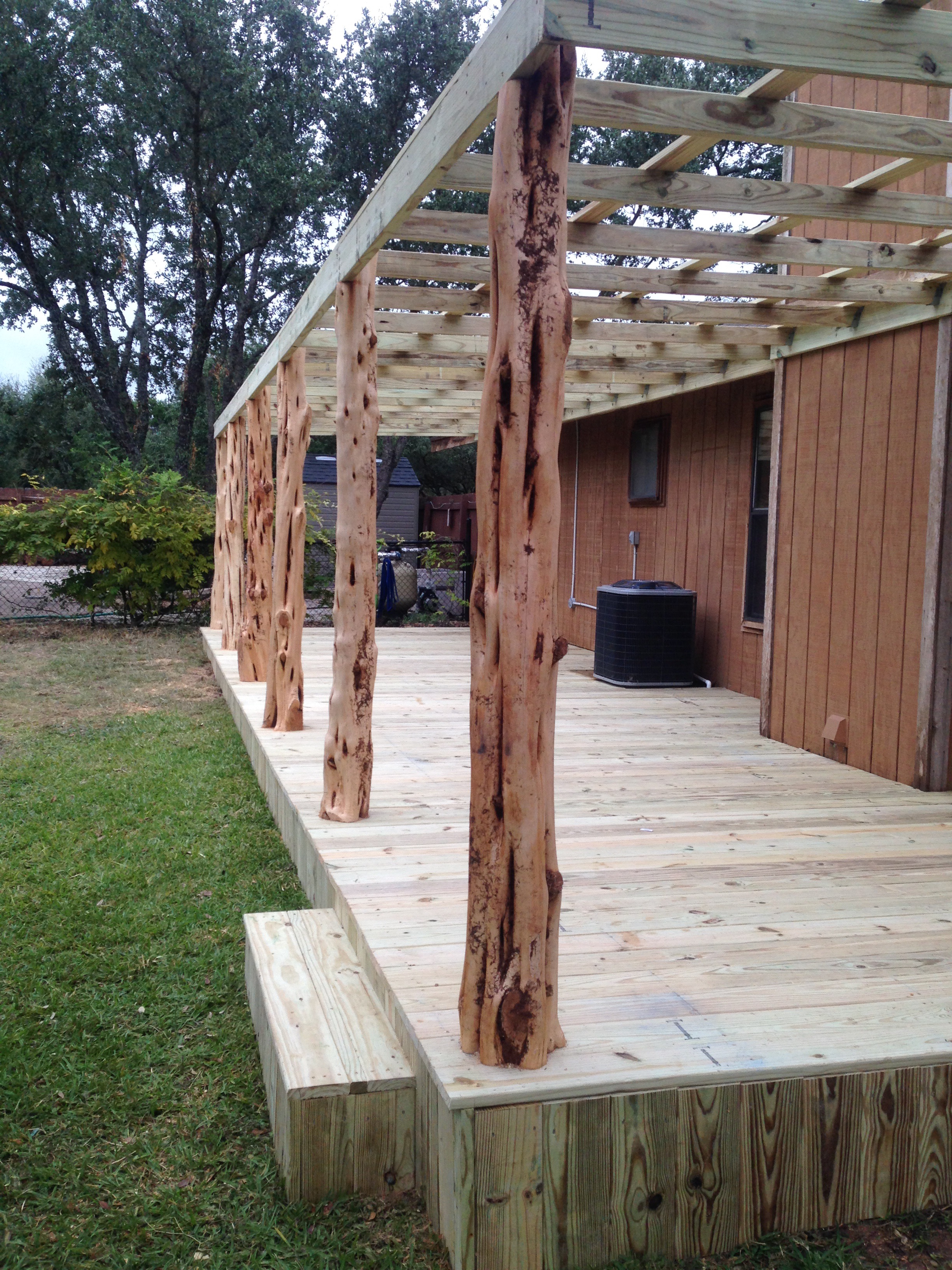 We just completed this rustic deck with natural tree posts in Leaky, Texas. I think the look turned out pretty good! We will be going back to treat the wood after a roofing company installs a steel roof in January.