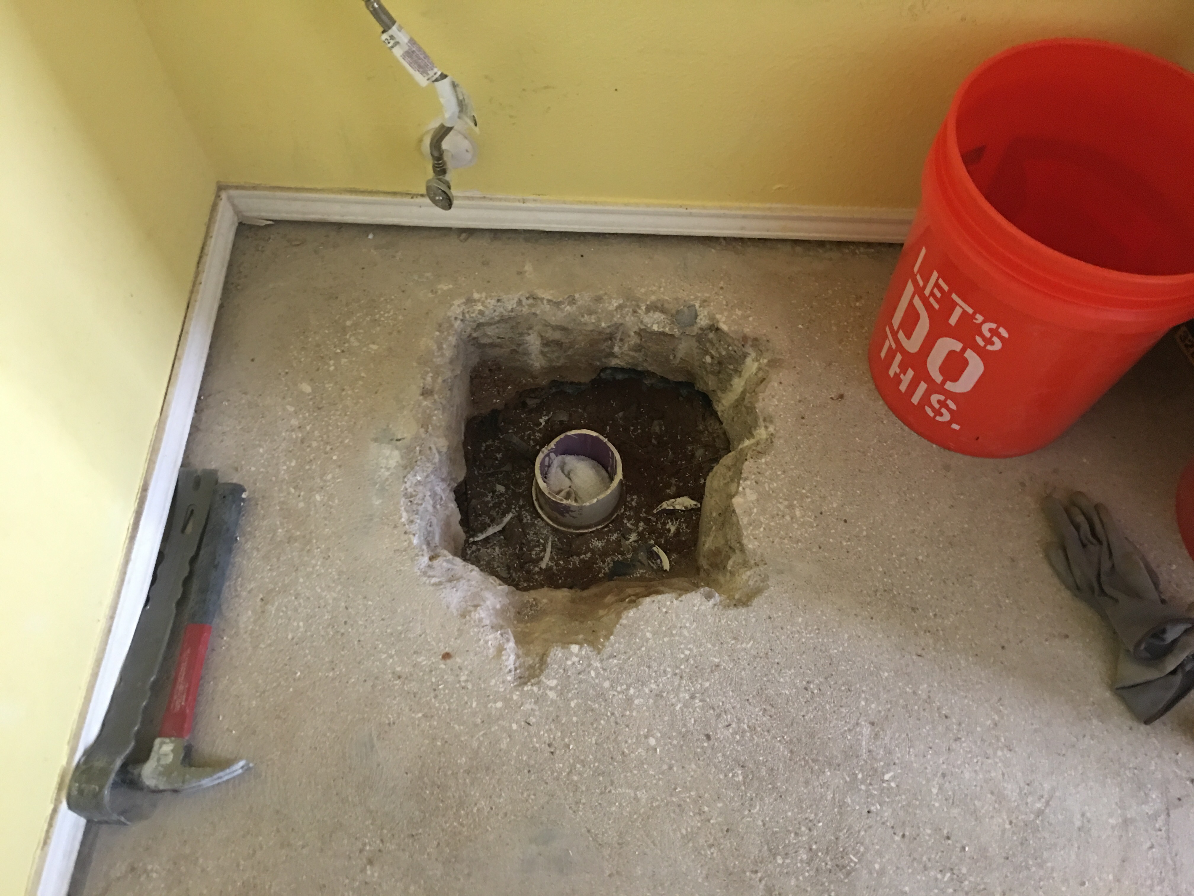 The builders at this house in Keller, Tx had installed the drain to the toilet incorrectly so they installed an offset to position the toilet correctly. This affected the flow out of the toilet and caused it to back up repeatedly. So the repair was to jackhammer all of it out, remove the bends and bring it back up to its full capacity.