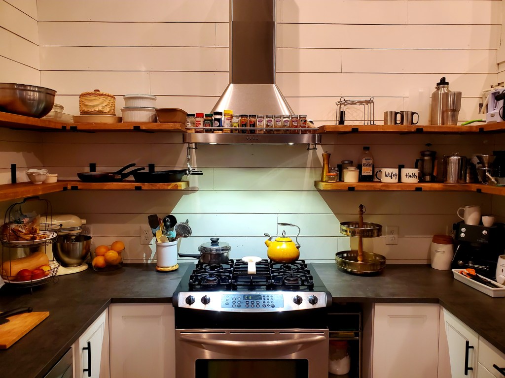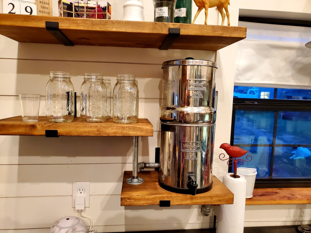 Here is some open shelving we installed. It had some customized features, like a drop down shelf for a water filter that had its own fill valve!
