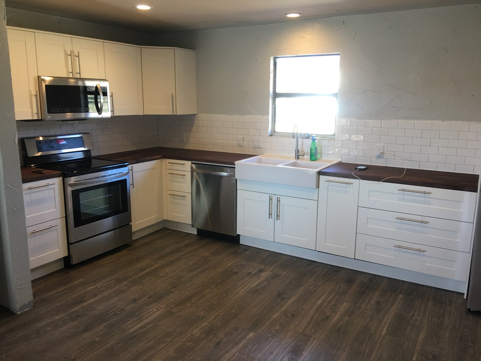 A kitchen, dining and laundry room remodel in Springtown. New cabinets, farmhouse sink, butcher block countertops, floor and subway tile backsplash. The plumbing and electrical had to be reconfigured to accommodate the new configuration. The customer is adding shelves above the sink at a later date.