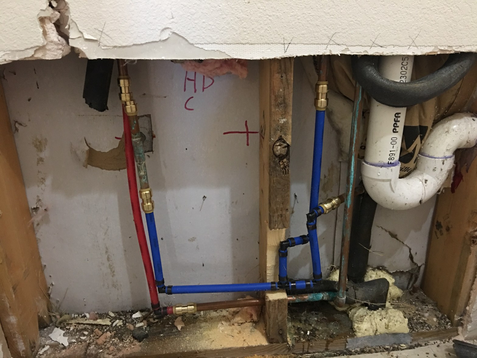 Working on a home today that had hot water coming from an exterior faucet! We opened the wall and used quite a bit of pex pipe to connect it back right and now have cold water!